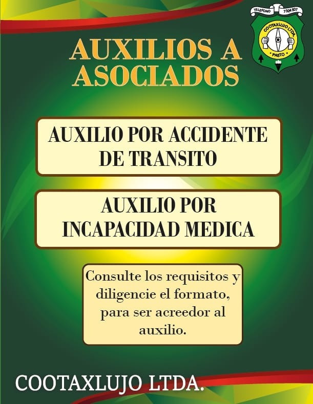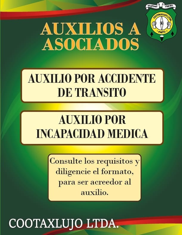 Como asociado de la Cooperativa tiene derecho a beneficiarse de los auxilios por Accidente de transito que sufra el vehiculo afiliado, Auxilio por incapacidad medica del Asociado y Auxilio por fallecimiento del Asociado. Recuerde consultar con la Administración el procedimiento y requisitos para hacerse acreedor a estos beneficios.